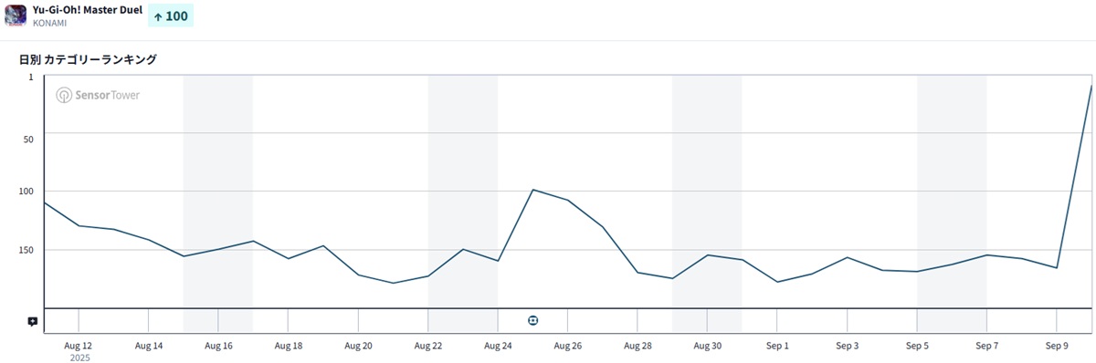 『遊戯王 マスターデュエル』は全対応機種累計で9,000万ダウンロードを突破したことを記念して、9月10日から合計1,000ジェムや新セレクションパックチケットなどをプレゼントするログインボーナスや、「召喚師アレイスター」「アクセスコード・トーカー」などのイラスト違いが出現するパックの登場など、ゲーム内キャンペーンを期間限定で実施中。順位を押し上げる原動力となったもよう。
