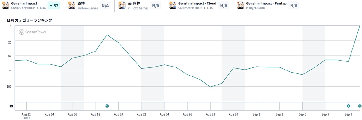 9月11日9時現在のApp Storeセールスランキング(ゲームカテゴリー)は、HoYoverseの『原神(げんしん)』が前日60位から一気に首位に浮上した。