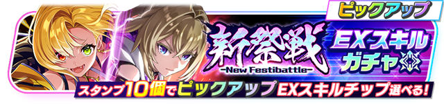 5種類の「EXスキルチップ」が新登場する。また、シャルロット(CV:内田真礼)とマサムネ(CV:悠木碧)の「EXスキルチップ」はピックアップで登場する。★5は「EXスキルチップ」のみ登場する。さらに、次のイベントが開催されるまで、本ガチャが1日1回無料になる。スタンプ1個で「セレクト★4メダル」が、スタンプ10個で「新祭戦EXスキルチップメダル」が獲得できるなど、ガチャスタンプカードでもらえる報酬が豪華になっている。