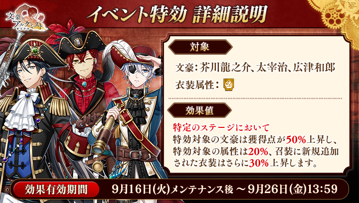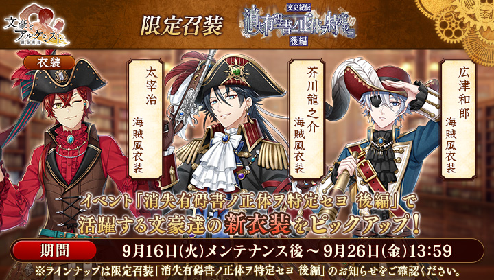 さらに、イベントと同時に開催される限定召装『消失有碍書ノ正体ヲ特定セヨ 後編』にて新規追加された「芥川龍之介」「太宰治」「広津和郎」の〈海賊風衣装〉を編成すると、得点の獲得率がそれぞれ30%上昇する。