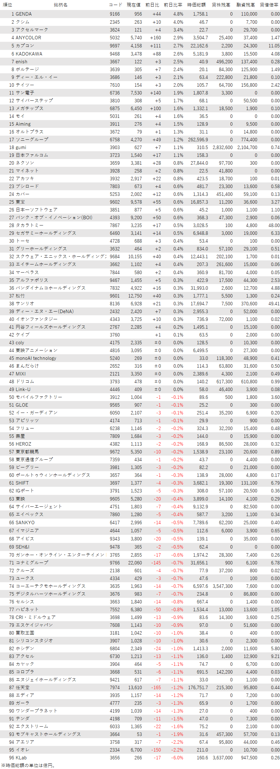 こうしたなか、ゲーム・エンタメ関連企業をみると、登録されている96銘柄のうち、上昇は42銘柄(44%)、下落は47銘柄(49%)、変わらずは7銘柄(7%)で、売り優勢だった。
