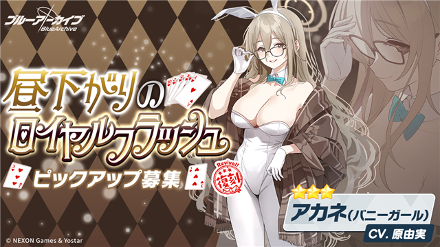 9月17日11:00より、復刻ピックアップ募集「昼下がりのロイヤルフラッシュ」を開催する。バニーガール衣装を纏った「アカネ(バニーガール)」さんのピックアップ募集になる。