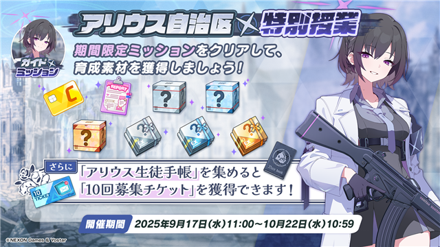 9月17日11:00より、ガイドミッション「アリウス自治区特別授業」を開催する。期間限定ミッションをクリアすると、生徒さん達の様々な育成素材が入手できる他、「アリウス生徒手帳」を集めると「10回募集チケット」も獲得することができる。