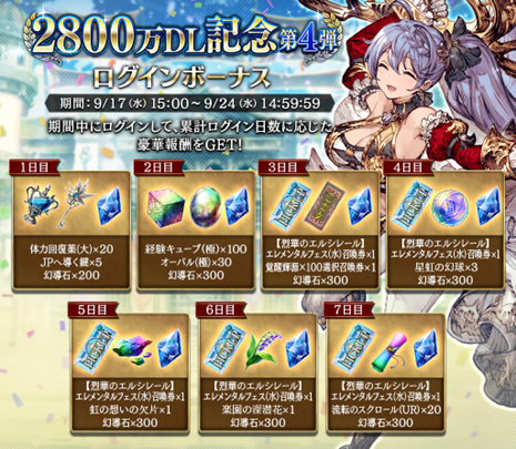 さらに、メインストーリー第3部のその後の物語、第3部インタールード第2弾「未来より来たる闇」が公開中。また、新ユニット「烈華のエルシレール」をピックアップした「エレメンタルフェス~水属性~」を開催。召喚ごとに獲得できる「【9月】エレメンタルフェス(水)召喚メダルA」は、交換所にて豪華アイテムと交換が可能。