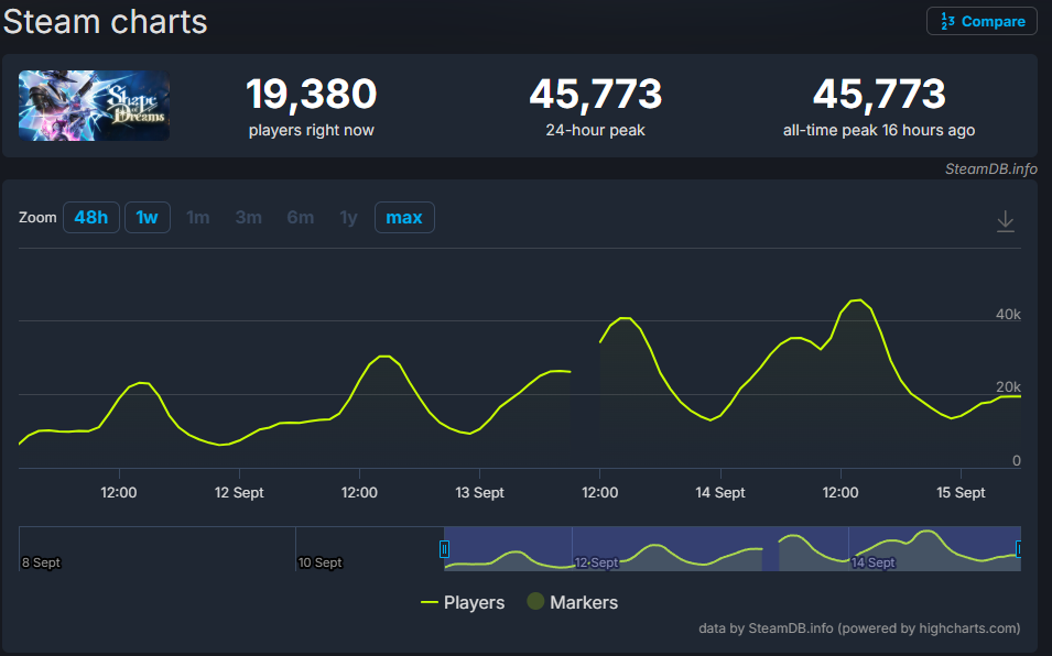 『Shape of Dreams』は、先日2025年9月11日(木)、Steamにてリリース。好評を博し、リリース後7日間で累計販売数が30万を突破、同時接続数が45,773を超えた。