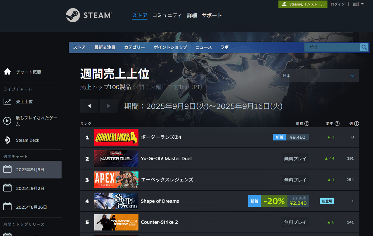 Steamの売上上位チャートで、グローバルで週間4位、日本国内でも最高2位・週間4位にチャートイン。