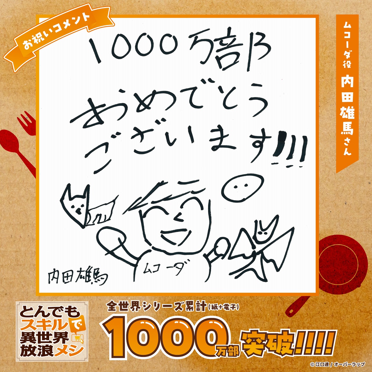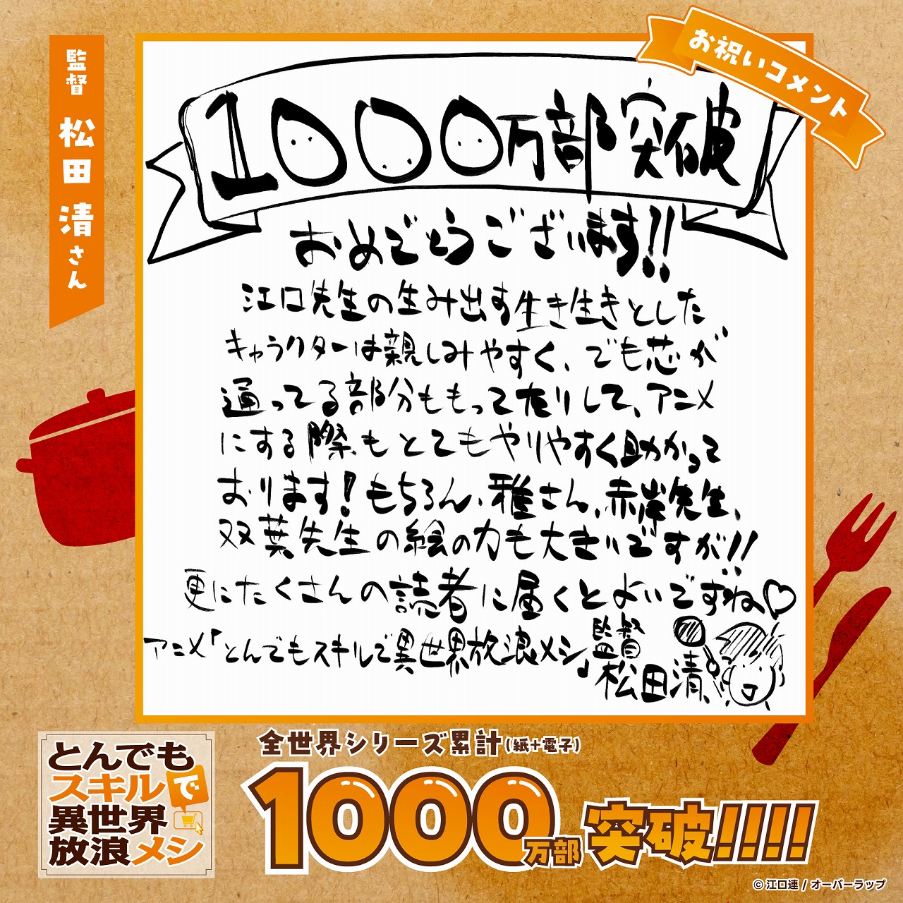 オーバーラップは、ライトノベルレーベル「オーバーラップノベルス」より刊行している『とんでもスキルで異世界放浪メシ』(著:江口 連、イラスト:雅)が、このたび全世界シリーズ累計1,000万部(紙+電子)を突破したと発表。