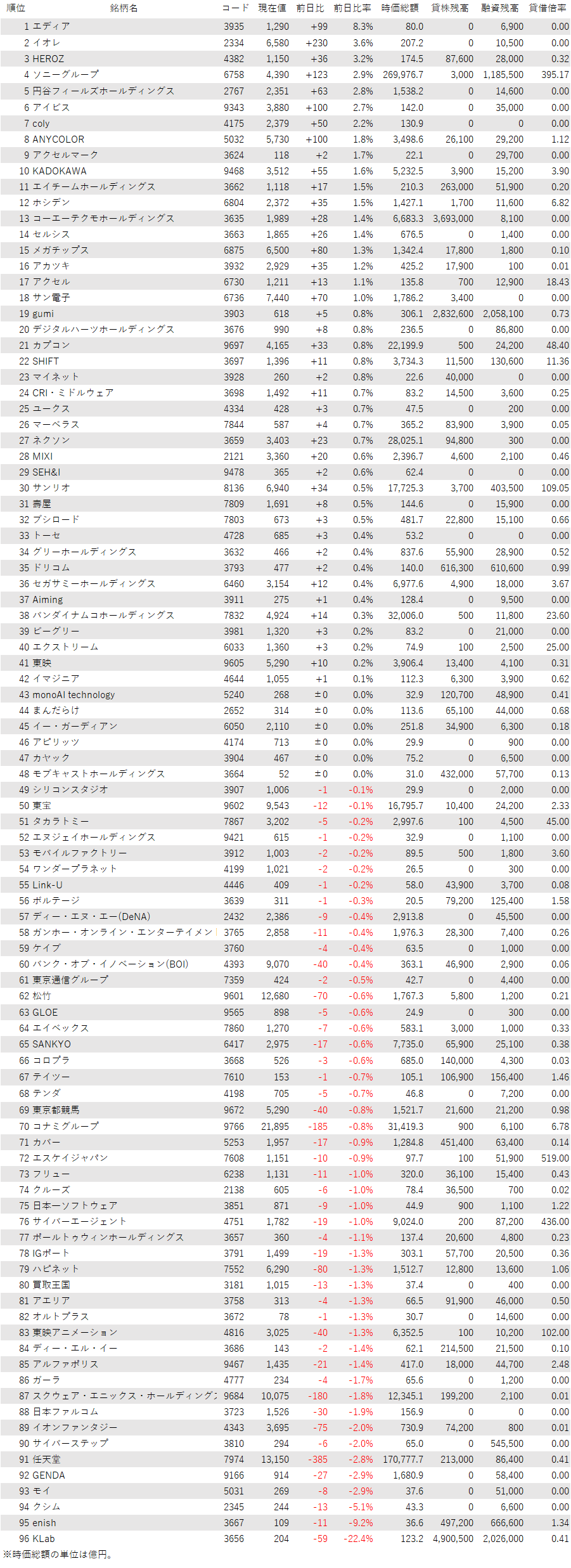 アニメやホビーなどその他コンテンツ関連銘柄は、サンリオ<8136>、KADOKAWA<9468>、エディア<3935>、ブシロード<7803>が高く、タカラトミー<7867>、東宝<9602>、IGポート<3791>、GENDA<9166>、東映アニメ<4816>、フリュー<6238>が安い。