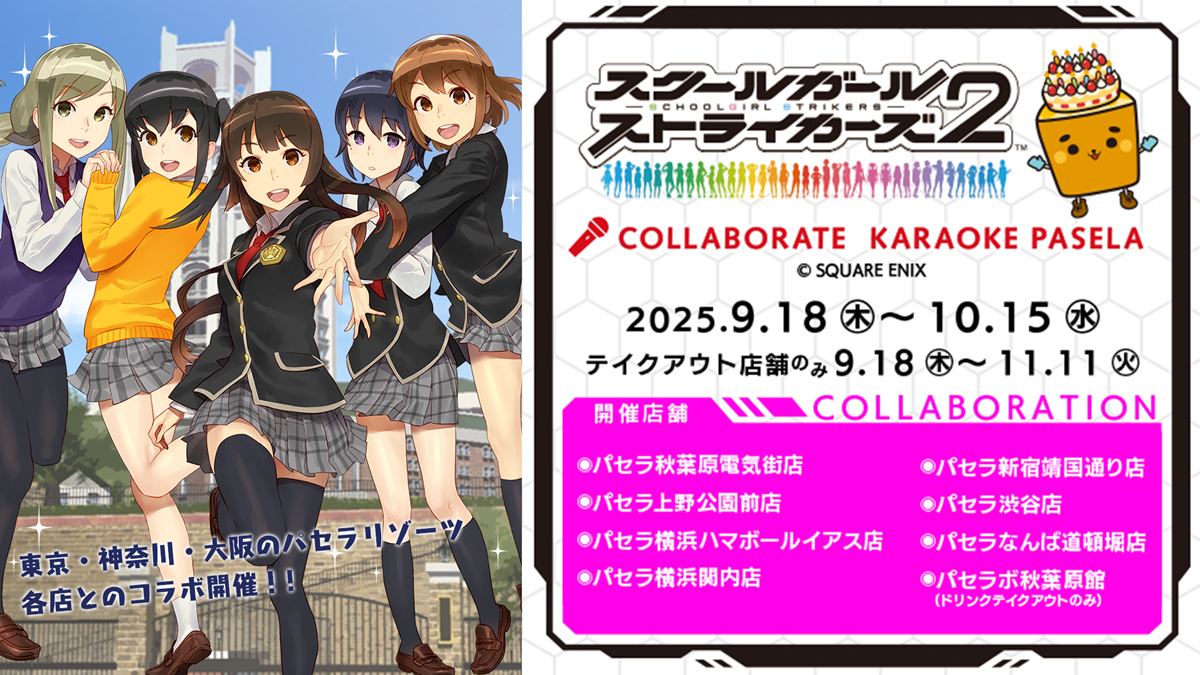 スクウェア・エニックスは、スマートフォン向けゲーム『スクールガールストライカーズ 2(以下スクスト 2)』において、本日 2025 年 9 月 18 日(木)より、東京・神奈川・大阪のパセラリゾーツ各店にてスクストグランドフィナーレコラボを開催している。