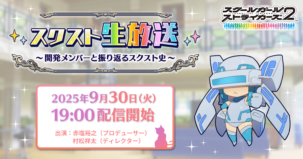 2025 年 9 月 30 日(火)19 時頃より、「スクスト生放送~開発メンバーと振り返るスクスト史~」を配信! ファンアートコンテストの受賞作品の発表や、隊長さんからの質問に対する回答などをお届け。