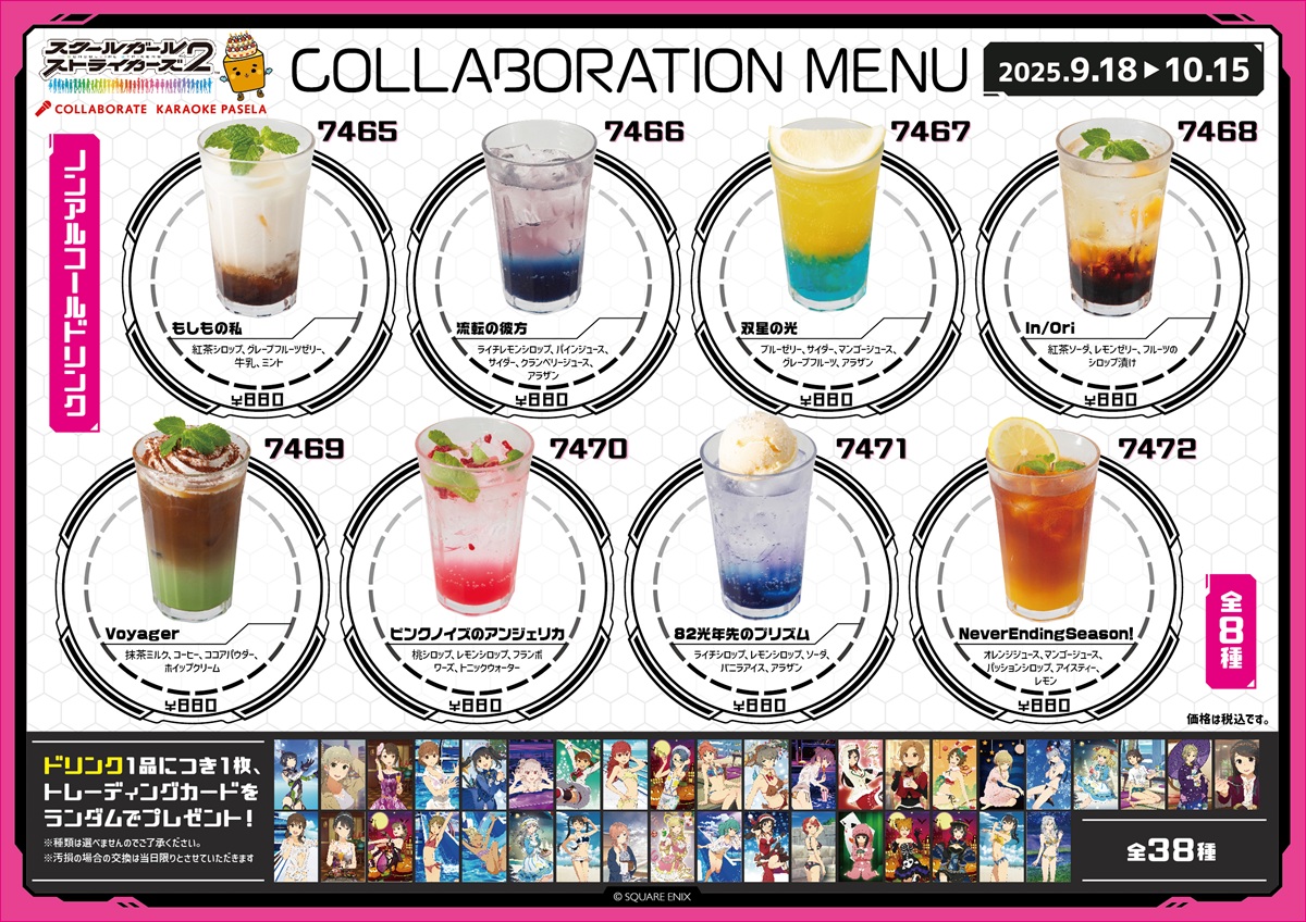 本コラボでは、スクストのグランドフィナーレを盛り上げるのにピッタリなフードや、メインストーリーの各エピソードからそれぞれのエンディングテーマ楽曲をモチーフとしたドリンクを用意。さらに、注文するコラボメニューに応じて、オリジナルポストカード(全 4 種)、またはトレーディングカード(全 38 種)をプレゼントする。