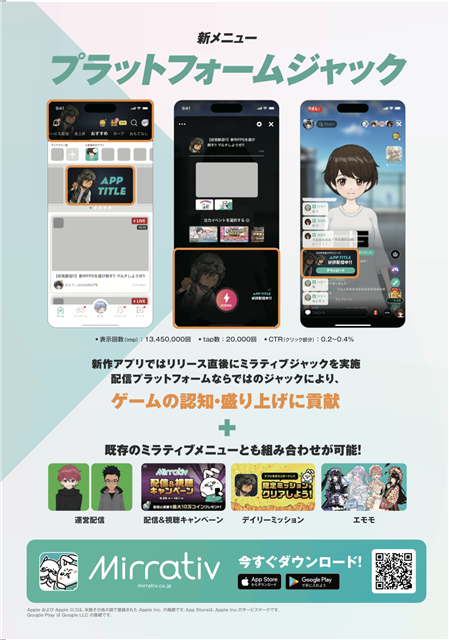 「All for Streamers」のコンセプトで、YouTube・Twitch・Mirrativなどの各配信プラットフォームで活動する配信者(VTuber/ストリーマー等)を支援するミラティブは、9月25日〜28日の4日間、幕張メッセで開催される「東京ゲームショウ2025(TOKYO GAME SHOW 2025)」のビジネスデイにおいて、9月25日と26日の2日間、ビジネスソリューションコーナーに出展する。ブースでは、これまでのMirrativ広告の事例はもちろんのこと、新たにリリースした広告メニュー「ぷらっとフォームジャック」についても紹介を行う予定。
