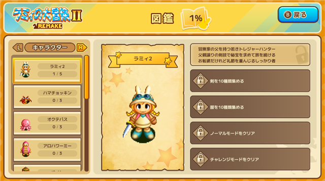 ランダム生成のダンジョンに挑み、様々なアイテムを駆使して脱出を目指す「不思議のダンジョン」系のローグライクRPG「ラミィの大冒険」シリーズ。本作はその第1作・第2作を、当時のドット絵の雰囲気はそのままにUnityエンジンでフルリメイク。操作性やUI等の改善のみならず、図鑑やカラー変更機能、チャレンジモードや追加ストーリーなどの多くの追加要素を加えている。