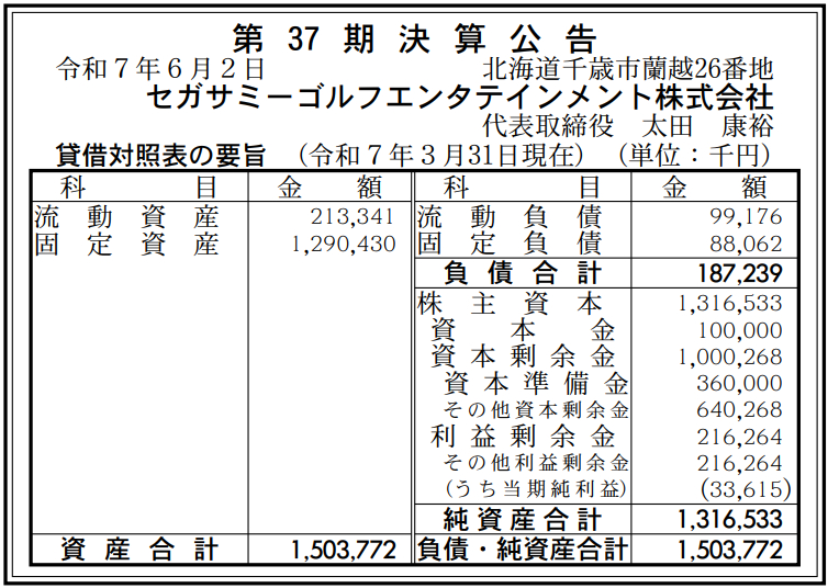 セガサミーゴルフエンタテインメントの2025年3月期(第37期)の決算は、最終利益が前の期比17.8%減の3300万円と減益だった。前の期(2024年3月期)の実績は、最終利益4000万円だった。9月19日付の『官報』に掲載された「決算公告」で判明した。