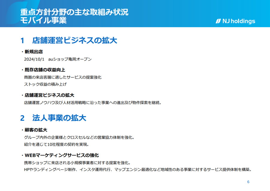 今後の重点方針分野の取り組みについては、ゲーム事業では、自社IPの創出(企画・開発・販売、他社IP活用)と、AI技術を活用した生産性向上(社内開発基盤整備、生成AIツール利用、勉強会開催)に注力する。モバイル事業は、店舗運営ビジネスの拡大(新規出店、既存店収益向上、ノウハウ活用)と法人事業の拡大(顧客拡大、WEBマーケティングサービス強化)を進める。