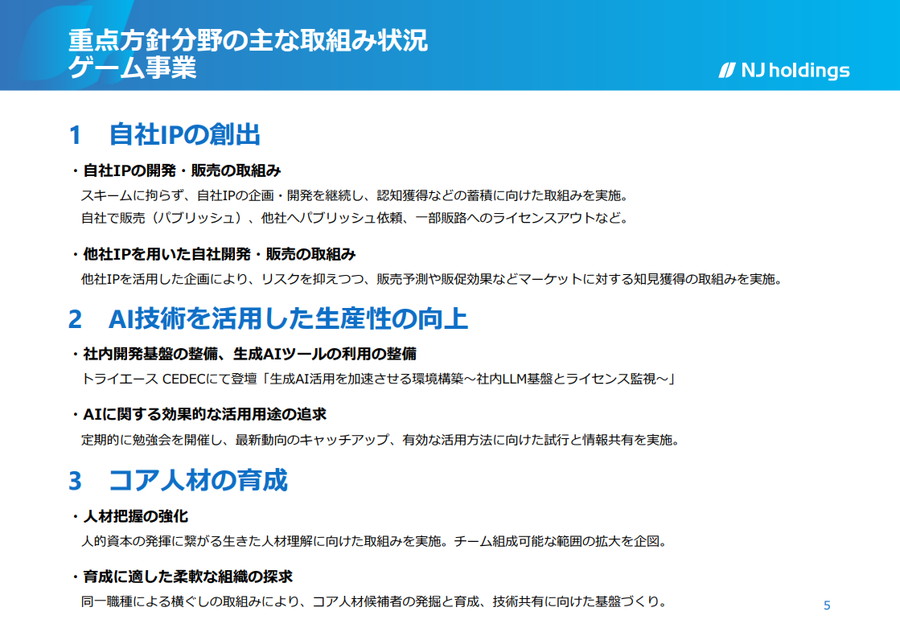 エヌジェイHD、中期計画1年経過の状況を報告 26年6月期は計画を下回る見通しも変更なし ゲーム事業は自社IPの創出とAIによる生産性向上に注力