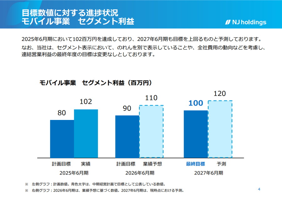 また、ゲーム事業のセグメント利益も2027年6月期の目標6億円は変更ないという。2026年6月期は海外対応事業の通年寄与により増益を見込み、2027年6月期には開発案件の収益改善や新規受注の成果が本格的に表れると予測している。他方、モバイル事業のセグメント利益は、2025年6月期に1億0200万円を達成し、2027年6月期も目標を上回ると予測している。