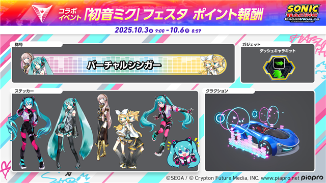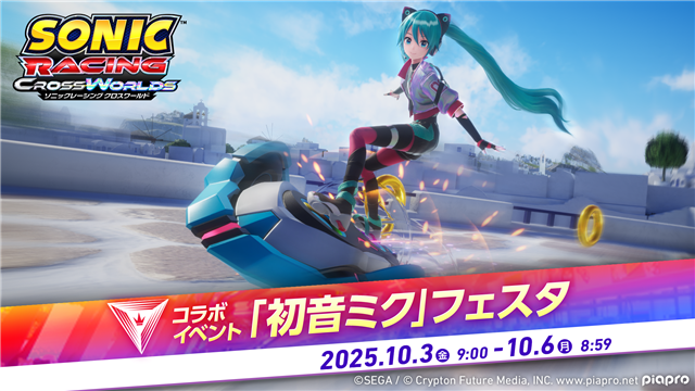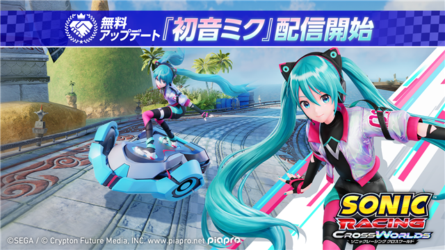 ゲーム本編とシーズンパスがセットになった『ソニックレーシング クロスワールド』デジタルデラックスエディションを購入すると、本日22日13時より、アーリーアクセスが可能。アーリーアクセス開始と同時に、『Project ONSOKU』の全5曲および「初音ミク」もゲーム内に登場する。