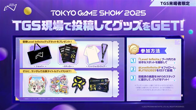 Level Infiniteブース内にて写真撮影を行い「#LITGS2025」のハッシュタグを付けた上で、自身のSNSアカウントに投稿。投稿済画面をインフォメーションスタッフに提示すると、グッズをプレゼントする。