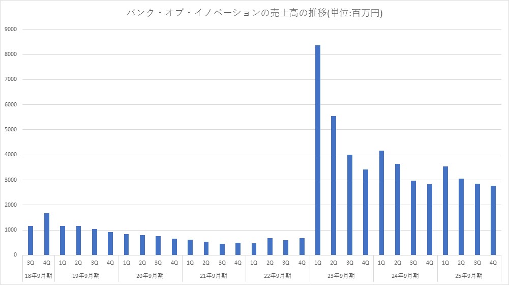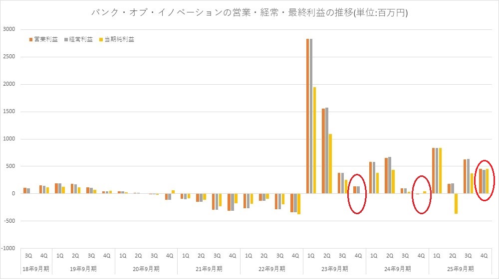 バンク・オブ・イノベーション(BOI)<4393>は、9月19日、2025年9月期の業績見通しを開示した(関連記事)。これに基づいて第4四半期(25年7~9月)の業績を計算すると、売上高27億7300万円(前年同期比2.3%減)、営業利益4億5700万円(前年同期は300万円の損失計上)、経常利益4億3400万円(同7133.4%増)、最終利益4億5200万円(同927.3%増)となる見通し。