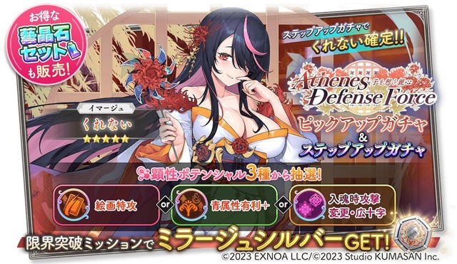 イベント「【Athenes Defense Force】子を想う親心」にて獲得点アップの効果がある、新登場イマージュのピックアップガチャを期間限定で開催する。また、ステップ5にて★5イマージュ「くれない」を確実にゲットできる5ステップアップガチャも同時開催する。