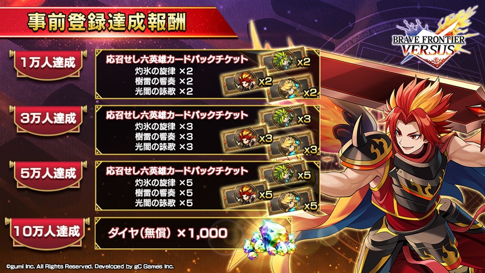 事前登録開始を記念して本日より、App StoreおよびGoogle Playにて、世界同時開催の事前登録記念キャンペーンを実施する。本キャンペーンは、事前登録件数が1万・3万・5万・10万を達成するごとに、ゲームリリース時に報酬が配布される目標達成型の企画となっている。