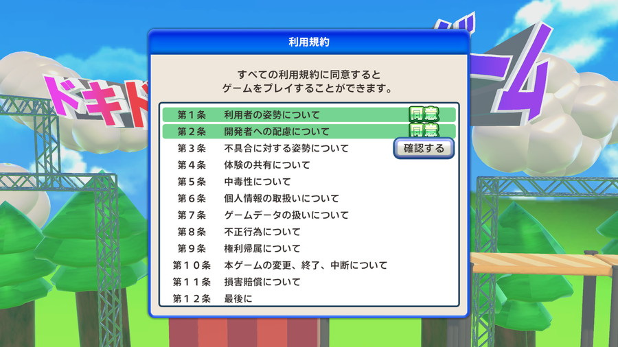 「ドキドキアクションゲーム」という横スクロールアクションゲームで、プレイするには全12項目の利用規約に同意する必要がある。
