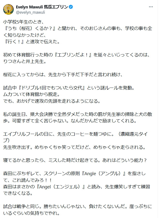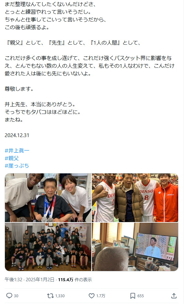 ▲2025年1月2日、恩師井上氏の逝去にあたってエブリン氏の追悼ツイート