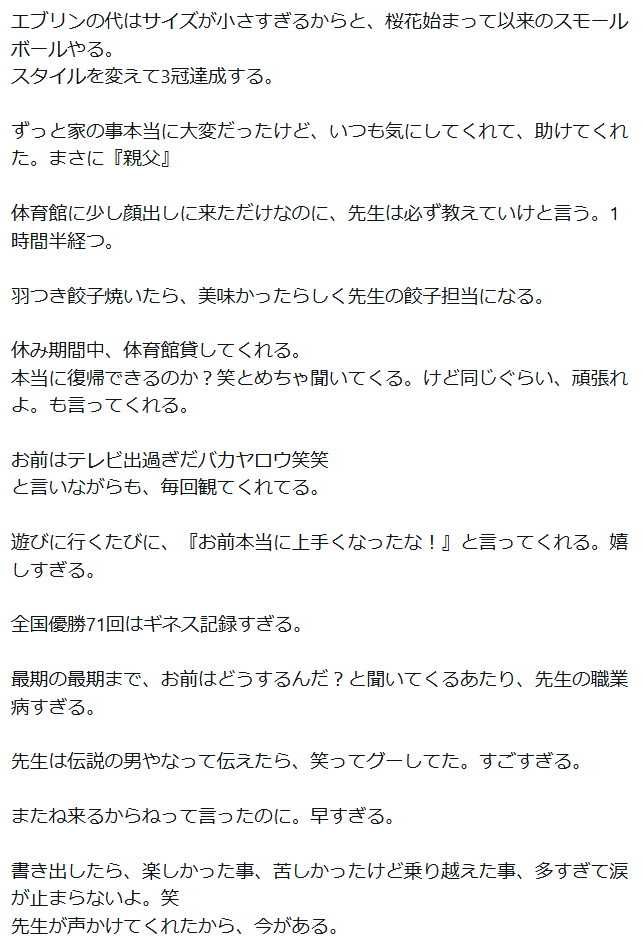 まあ、普通に比べると際どいほどに練習をさせてた部分があったことは否定できないですが笑。でも井上先生とは人と人としてのキズナがあったんですよね。体育館を一歩でるとタメ口OKなんですよ。非常にフラットな関係性を築いていました。