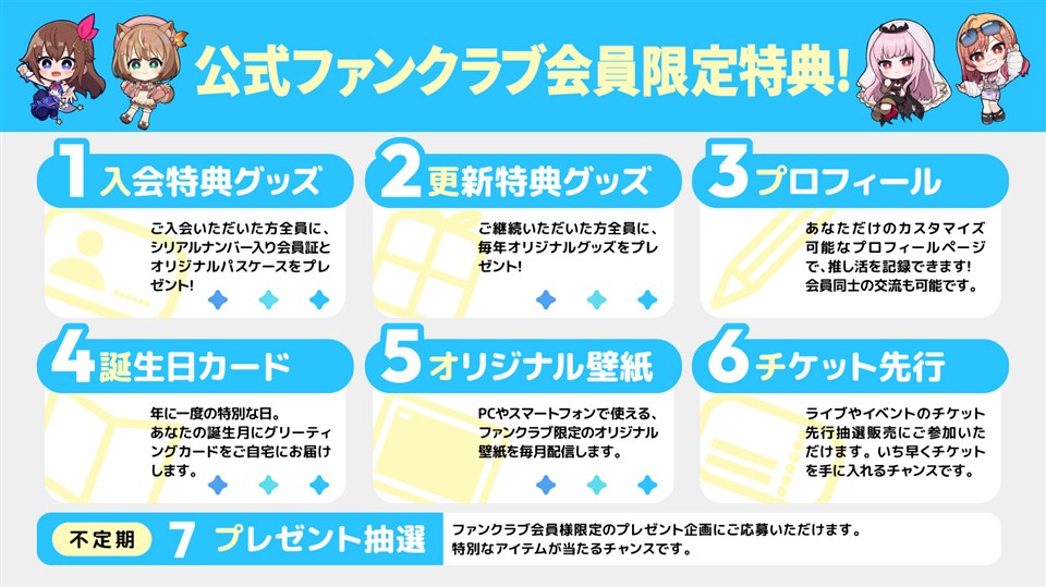 今後も、ファンクラブを通じて、ここでしか体験できない企画やコンテンツを順次追加していく予定だ。最新情報は、各ファンクラブの公式サイトおよび公式SNSアカウントにて随時発表していく。