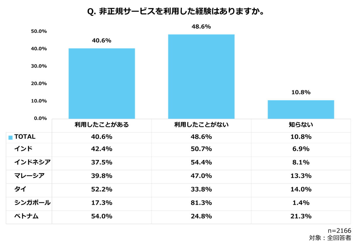 アニメ視聴プラットフォームについては、非正規サービスを利用したことがない(48.6%)が利用したことがある(40.6%)を全体として上回る結果となりました。国別で見るとベトナム、タイでは依然として非正規サービス利用経験者が優勢です。