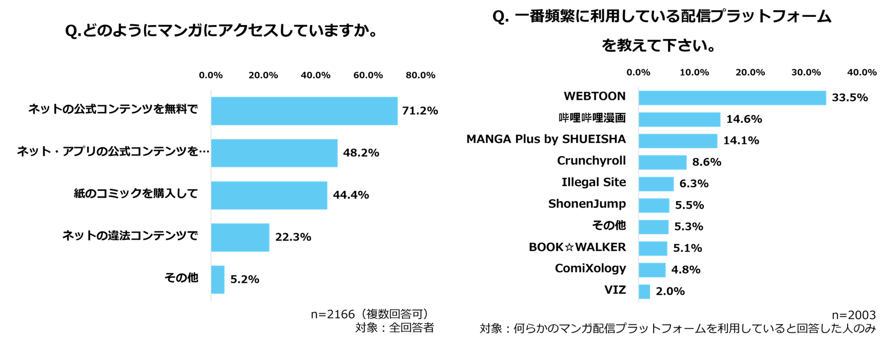頻繁に利用しているマンガプラットフォームは、1位「WEBTOON」(33.5%)、2位「哔哩哔哩漫画(bilibili漫画)」(14.6%)、3位「MANGA Plus by SHUEISHA」(14.1%)の順となり、これらが4位以下を大きく引き離し、3強を形成しています。