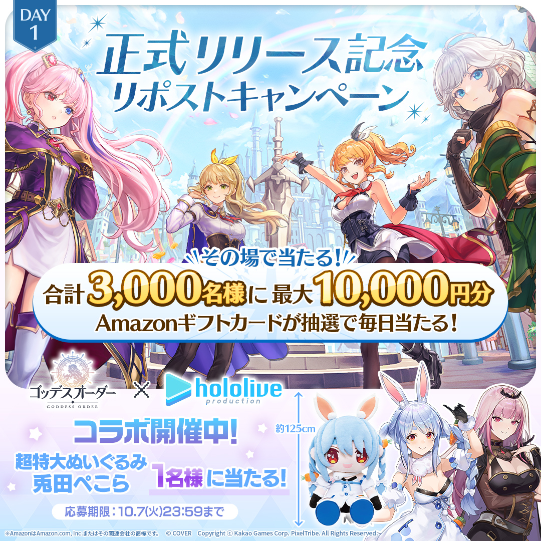 正式リリースを記念した「フォロー&リポストキャンペーン」を実施中。期間中VTuberグループ「ホロライブプロダクション」所属の兎田ぺこらさんの超特大ぬいぐるみと合計3,000名に「Amazonギフトカード最大10,000円分」を抽選でプレゼントする。抽選には毎日参加できるので『ゴッデスオーダー』公式Xをフォローした状態で、該当キャンペーンポストをリポストして参加しよう。