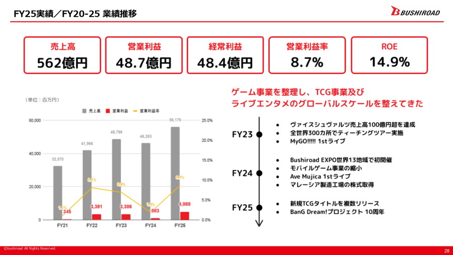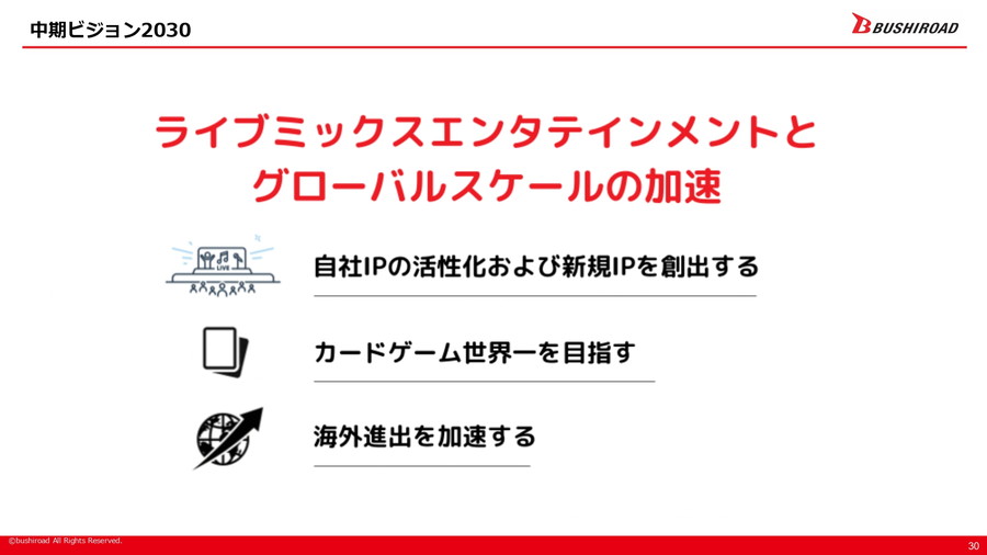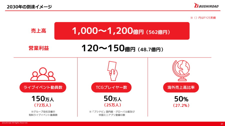 こうした環境を踏まえ、ブシロードは中期ビジョン2030において「ライブミックスエンタテインメントとグローバルスケールの加速」「カードゲーム世界一の実現」「海外進出の加速」という三つの方向性を掲げている。その目標像として、FY25実績に対し、売上高を562億円から1000~1200億円へ、営業利益を48億7000万円から120~150億円へ拡大することを見込む。また、ライブイベント動員数を72万人から150万人に、TCGプレイヤー数を25万人から50万人に倍増させるほか、海外売上比率を27.2%から50%へ高めることを目標としている。