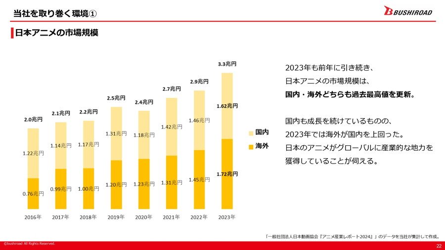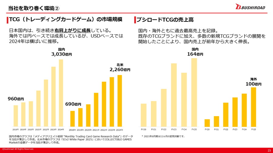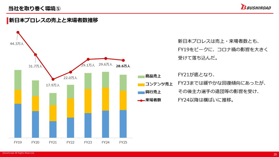 市場環境については、日本のアニメ市場が国内外で過去最高水準を更新し、特に海外での成長が顕著であることが指摘された。また、トレーディングカードゲーム(TCG)の国内市場も拡大を続けており、ブシロードのTCG事業も国内外で過去最高売上を記録している。さらに、ライブエンタテインメント市場や商品化・プライズゲーム市場もコロナ禍からの回復基調にある。新日本プロレスは一時的に売上や来場者数が落ち込んだが、FY23までは回復傾向を見せていた。