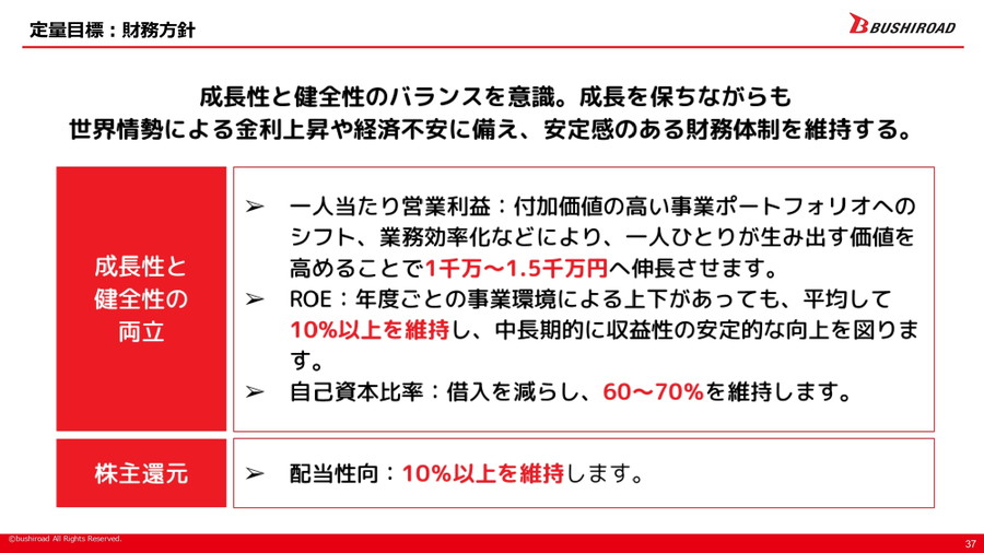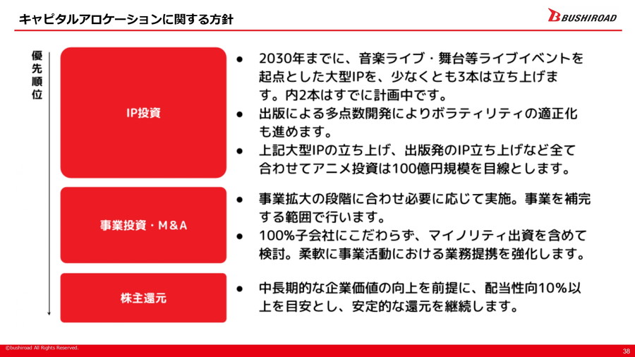 財務方針としては、成長性と健全性のバランスを重視し、1人当たり営業利益の向上、ROE10%以上の維持、自己資本比率60~70%の維持、配当性向10%以上を目標とする。さらにIPの事業規模については、2030年までに年商100億円以上の「Sランク」IPを3本以上、年商40億円以上の「Aランク」IPを4本以上、年商10億円以上の「Bランク」IPを5本以上保有することを目指す、としている。