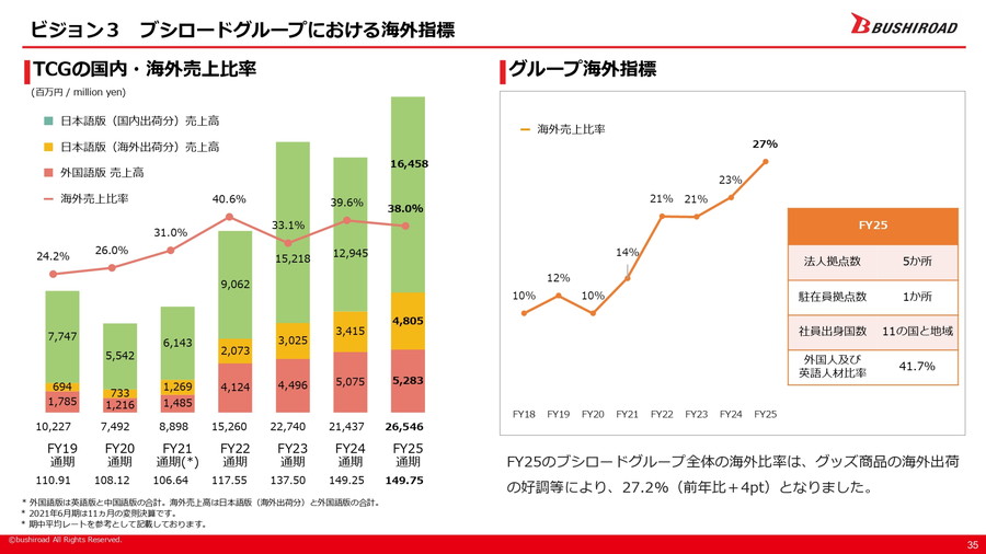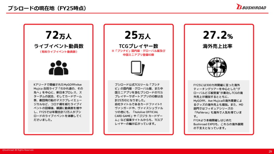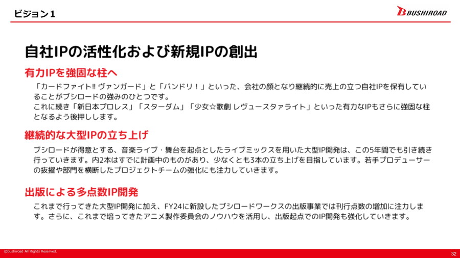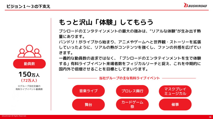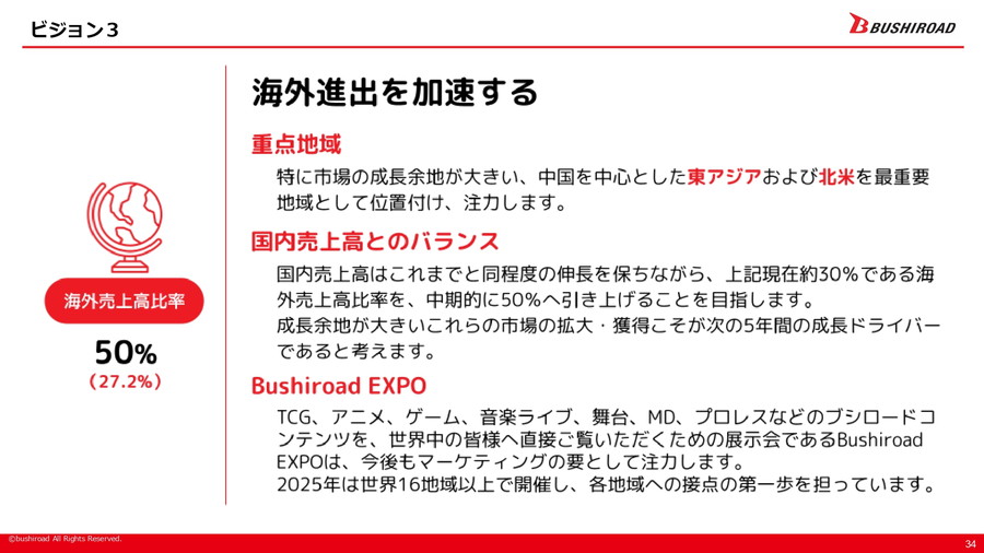 これらのビジョン達成に向けた施策としては、まず「カードファイト!! ヴァンガード」や「バンドリ!」といった有力IPを基盤に据えつつ、音楽ライブや舞台を起点とする大型IPの開発を継続し、出版事業による多点数IP開発も強化する。さらに、カードゲーム分野では「ヴァイスシュヴァルツ」「カードファイト!! ヴァンガード」を伸ばす一方、新たなIPとの協業を通じて新規タイトルの創出にも挑戦する。海外事業については、中国や北米を重点地域とし、海外売上比率を中期的に50%へ高めることを目指す。そのためのマーケティング施策として「Bushiroad EXPO」を軸に据える方針だ。また、ライブイベントの動員数を国内外で倍増させ、エンタテインメントを「生で体験する」機会を増やすことも重視している。