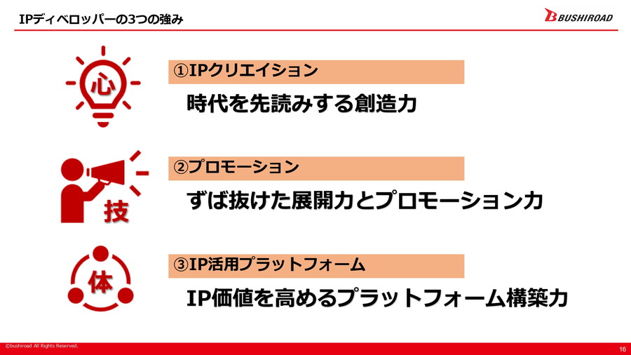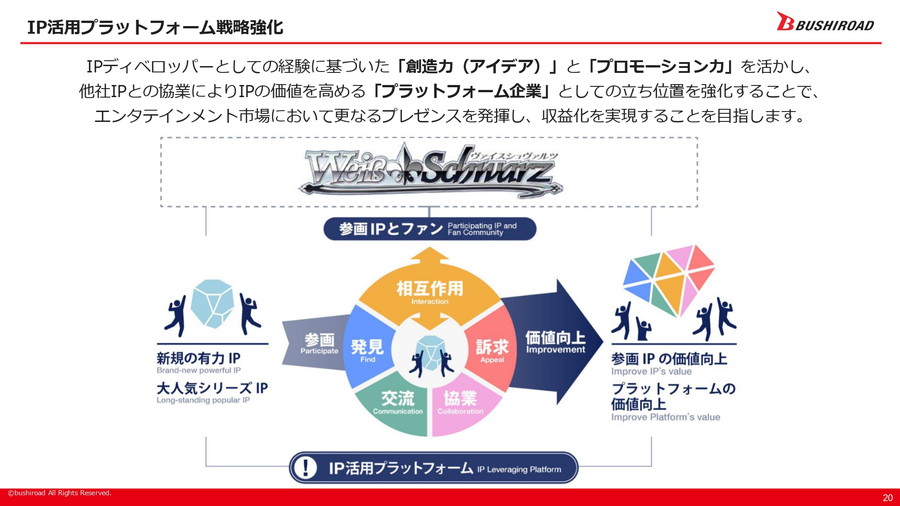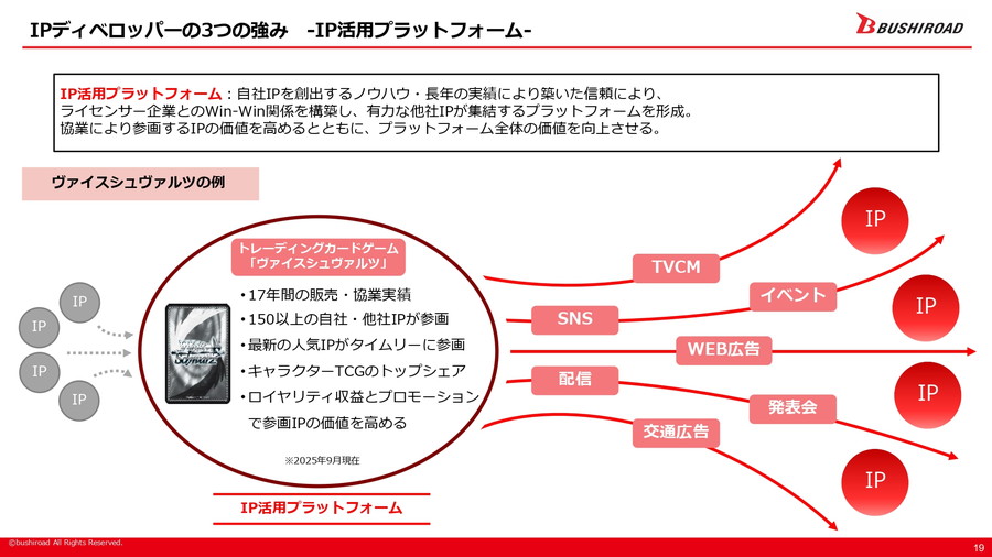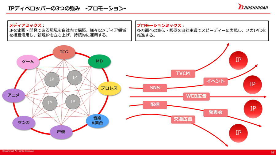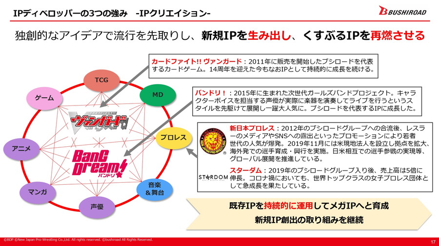 IPディベロッパー戦略の柱は三つあり、第一に「IPクリエイション」として時代を先読みする創造力を活かし、「カードファイト!! ヴァンガード」「バンドリ!」「新日本プロレス」「スターダム」といった代表的IPを生み出し育成してきた。第二に「プロモーション」では、自社主導によるメディアミックスやプロモーションミックスをスピーディーに展開し、IPのメガ化を推進する。第三に「IP活用プラットフォーム」として、自社IP創出のノウハウと信頼を基盤にライセンサー企業とのWin-Win関係を築き、他社IPが集結する場を形成している。「ヴァイスシュヴァルツ」はその代表例だ。