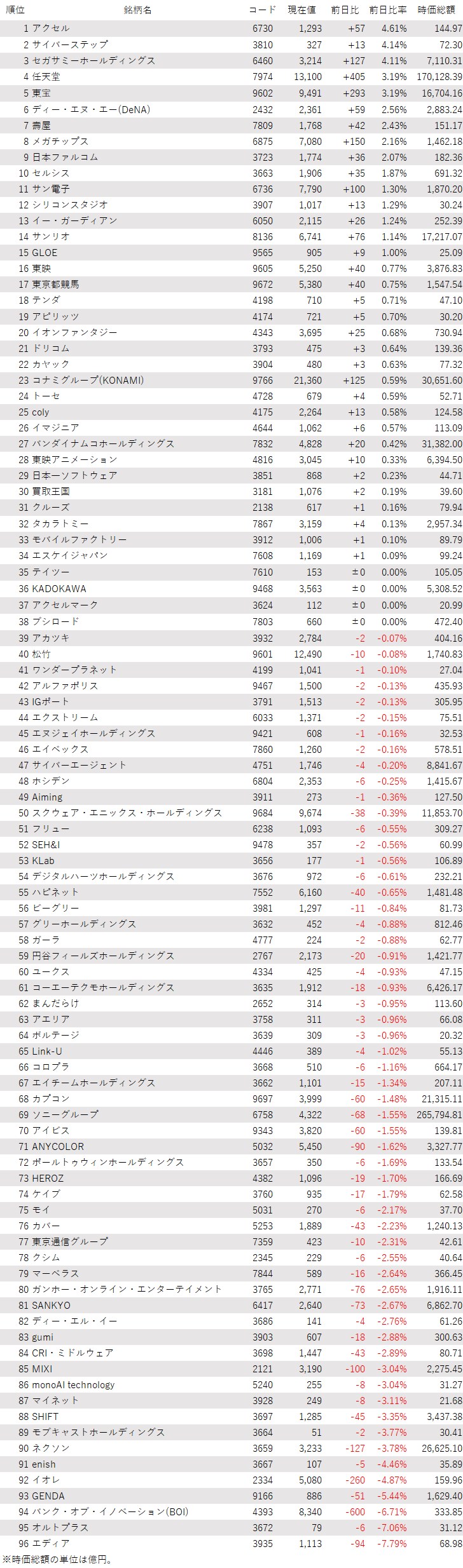そうした中でゲーム・エンタメ関連株の動きを見てみると、下記の表に登録しているゲーム・エンタメ関連企業96銘柄のうち、上昇は34銘柄(35%)、下落は58銘柄(60%)、変わらずは4銘柄(4%)で、下落した銘柄の方が多かった。