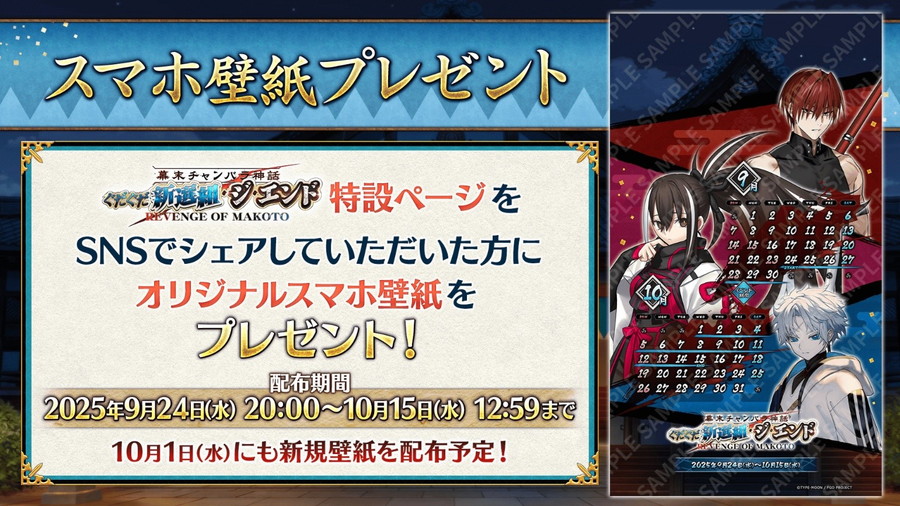 FGO PROJECTは、『Fate/Grand Order』で、期間限定イベント「幕末チャンバラ神話 ぐだぐだ新選組・ジ・エンド REVENGE OF MAKOTO」(本イベント)を2025年 9 月 24 日20:00 から開幕する。また、本イベントの開幕にあわせて、同日時より期間限定サーヴァント「★5 (SSR)河上彦斎」が新登場する「ぐだぐだ新選組・ジ・エンド 河上彦斎ピックアップ召喚」も開催する。