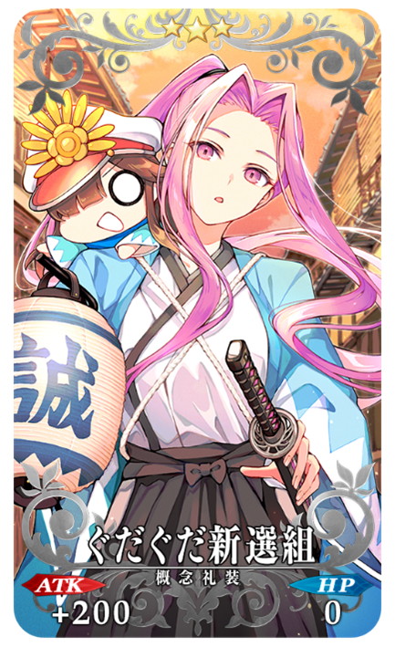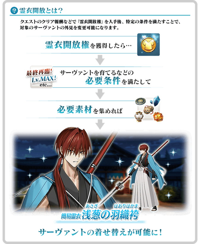本イベントの報酬として、「★4 (SR)原田左之助」の簡易霊衣「浅葱の羽織袴」の開放権が登場する。本イベントでは、特定のイベントクエストをクリアすることで上記の霊衣開放権を入手できる。また、霊衣を開放するには、霊衣開放権に加え、いくつかの条件を満たす必要がある。
