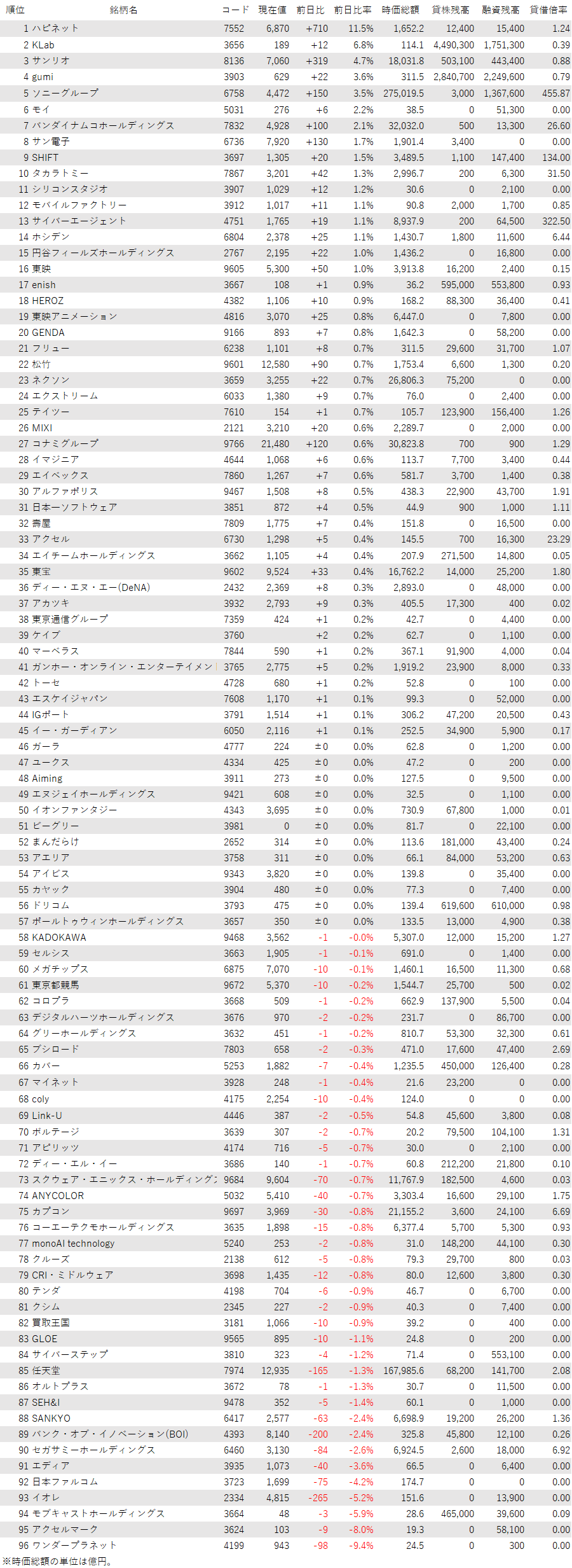アニメやホビーなどその他コンテンツ関連銘柄は、タカラトミー<7867>、サンリオ<8136>、東宝<9602>、IGポート<3791>、GENDA<9166>、東映アニメ<4816>、フリュー<6238>が高く、KADOKAWA<9468>、エディア<3935>、ブシロード<7803>が安い。