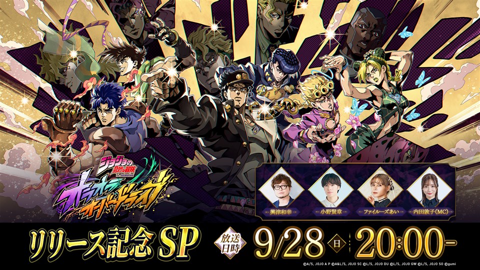 9月28日20時より「『ジョジョの奇妙な冒険 オラオラオーバードライブ』リリース記念SP」を配信する。ゲストとともにゲーム紹介のほか、本作の新情報も発表する。視聴者限定のキャンペーンも予定している。
