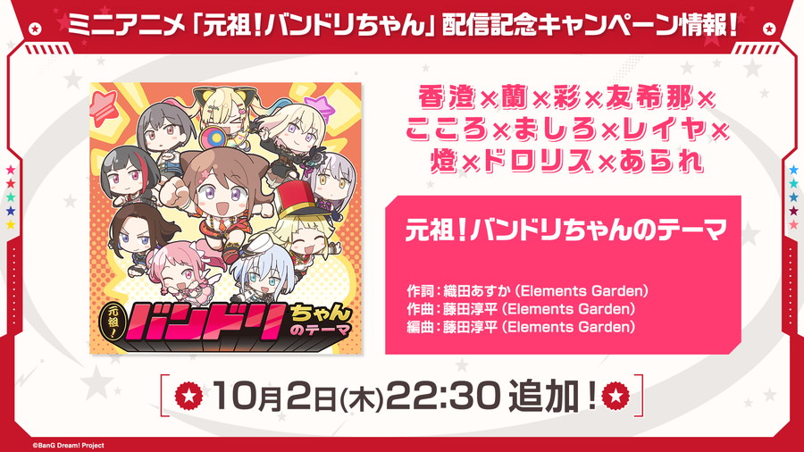 10月2日22時30分に、ミニアニメ「元祖!バンドリちゃん」の主題歌『元祖!バンドリちゃんのテーマ』の追加を予定している。