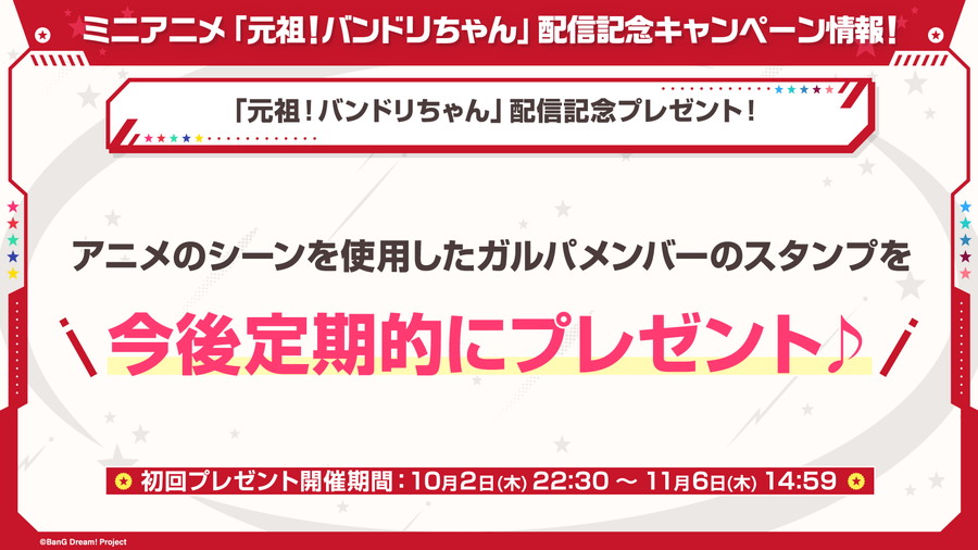 また、アニメ配信期間中、定期的にアニメのシーンを使用したガルパメンバーのスタンプをプレゼントする。初回は10月2日22時30分から11月6日14時59分まで開催する。