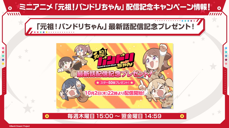 ミニアニメ「元祖!バンドリちゃん」配信期間中、毎週木曜日15時~翌金曜日14時59分までの期間中にログインすることで、スターを50個プレゼントする。