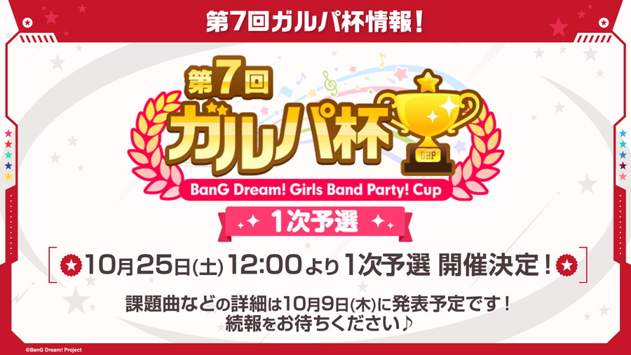 第7回 ガルパ杯の1次予選を、10月25日12時より開催する。課題曲などの詳細は10月9日に発表を予定しているので、続報を待ってほしい。