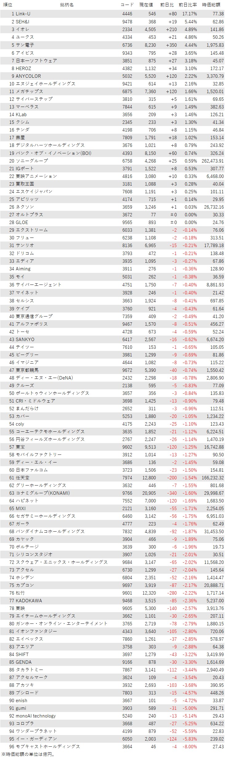 そうした中でゲーム・エンタメ関連株の動きを見てみると、下記の表に登録しているゲーム・エンタメ関連企業96銘柄のうち、上昇は26銘柄(27%)、下落は68銘柄(71%)、変わらずは2銘柄(2%)で、下落した銘柄の方が多かった。