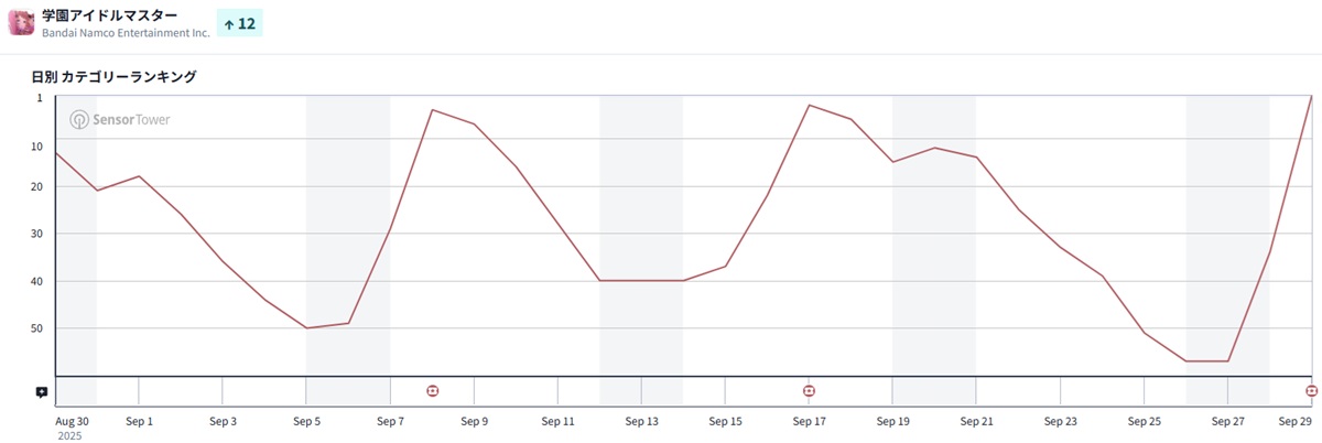 9月30日9時現在のApp Storeセールスランキング(ゲームカテゴリー)は、バンダイナムコエンターテインメントの『学園アイドルマスター』が前日34位から首位に躍り出た。