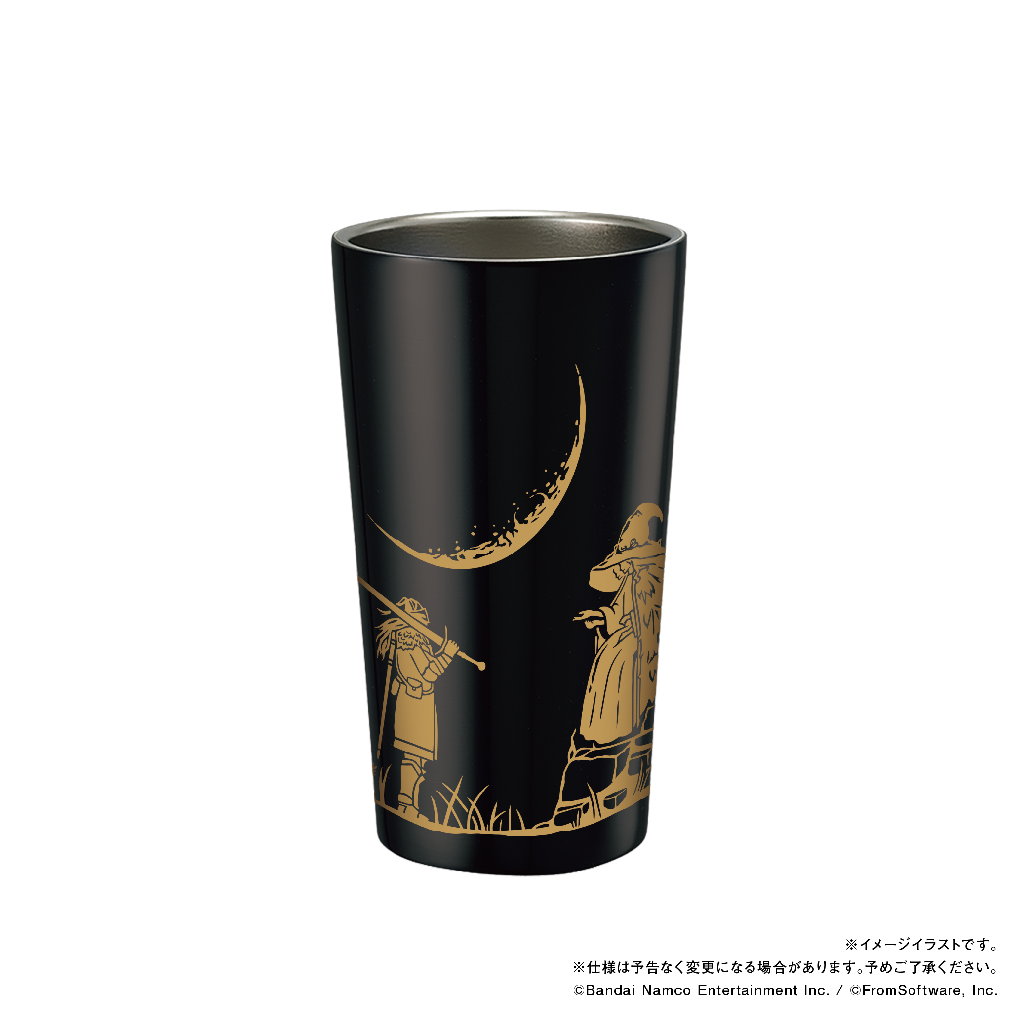 黒地に金が映える、魔女と騎士の出会いの情景がプリントされたステンレスサーモタンブラー。
